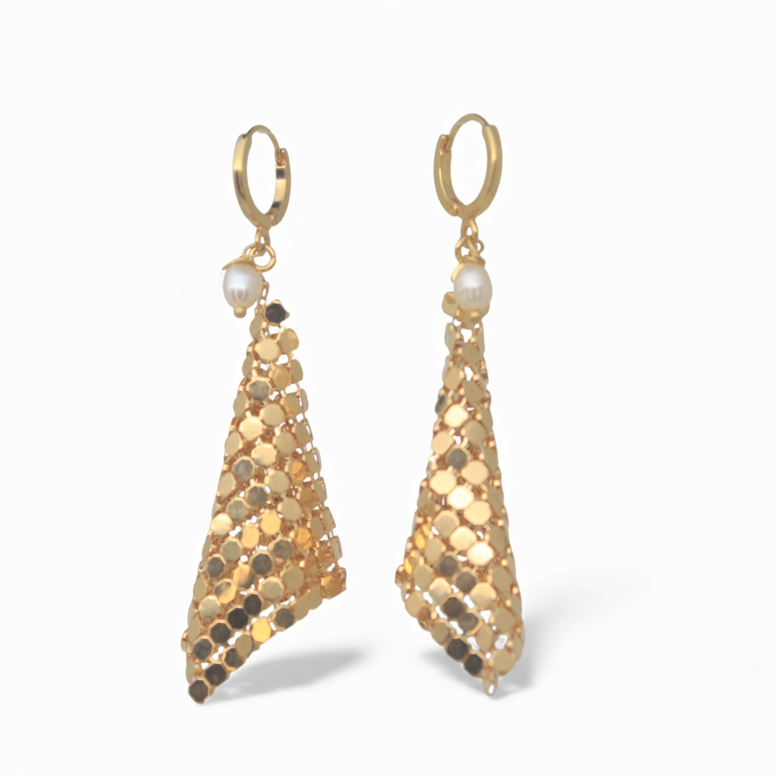 Réalisées en laiton plaqué or, elles associent la souplesse d’un maillage fin à l’élégance d’une perle de culture. Leur tombé fluide accompagne les gestes avec légèreté, tout en reflétant la lumière avec éclat.