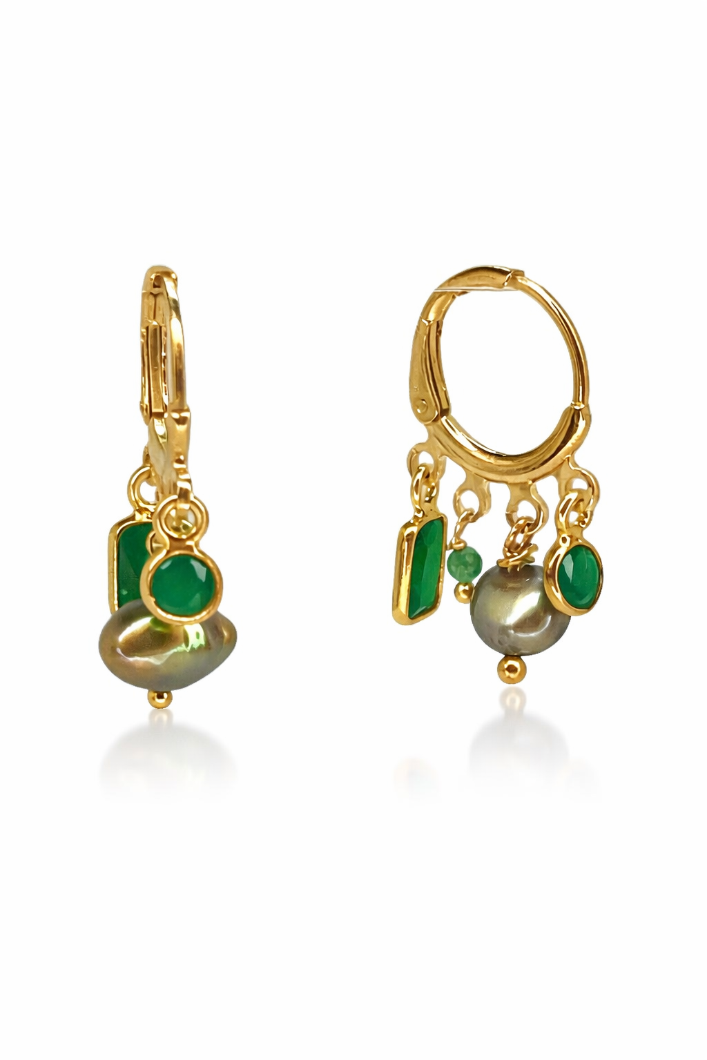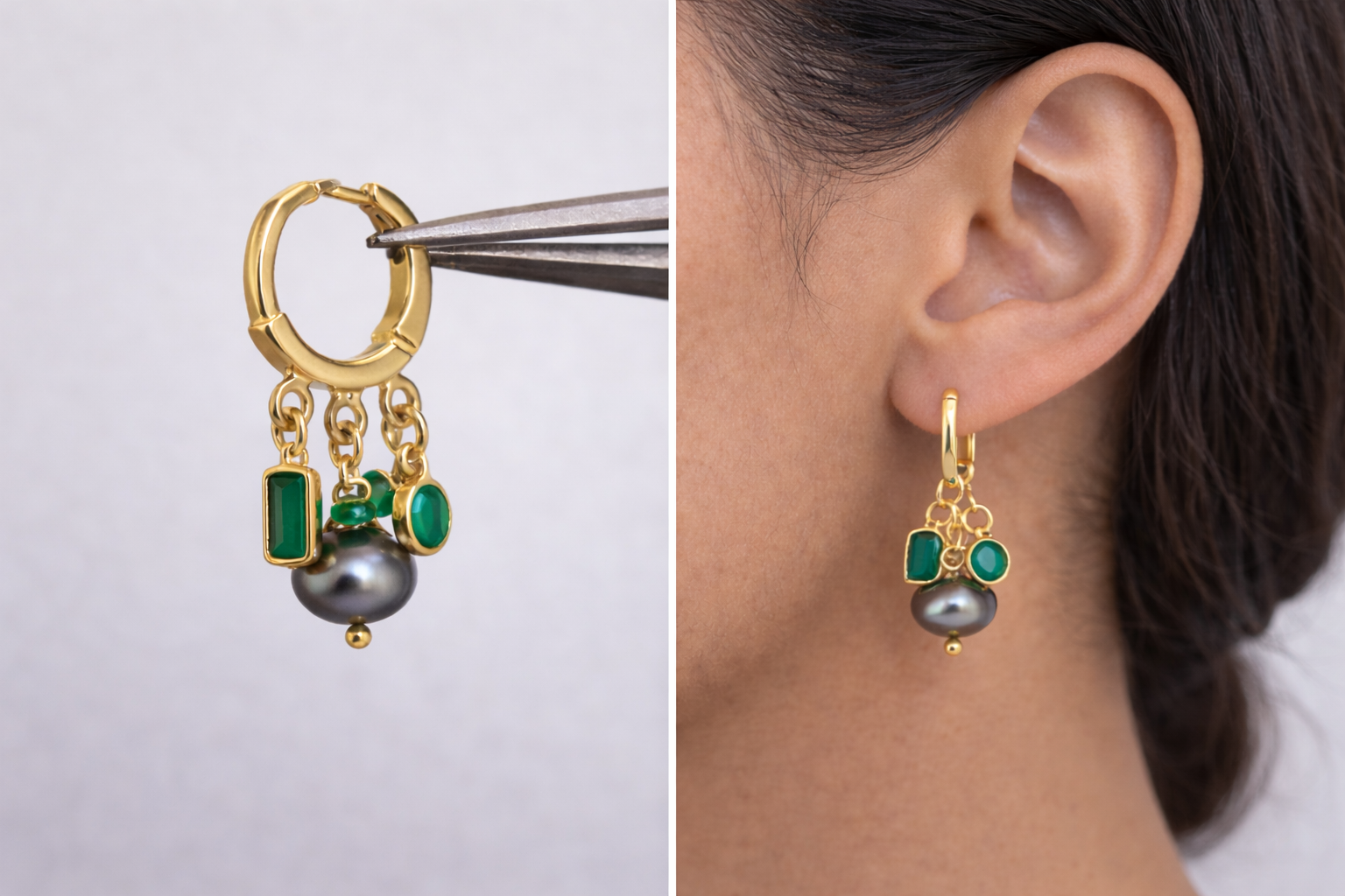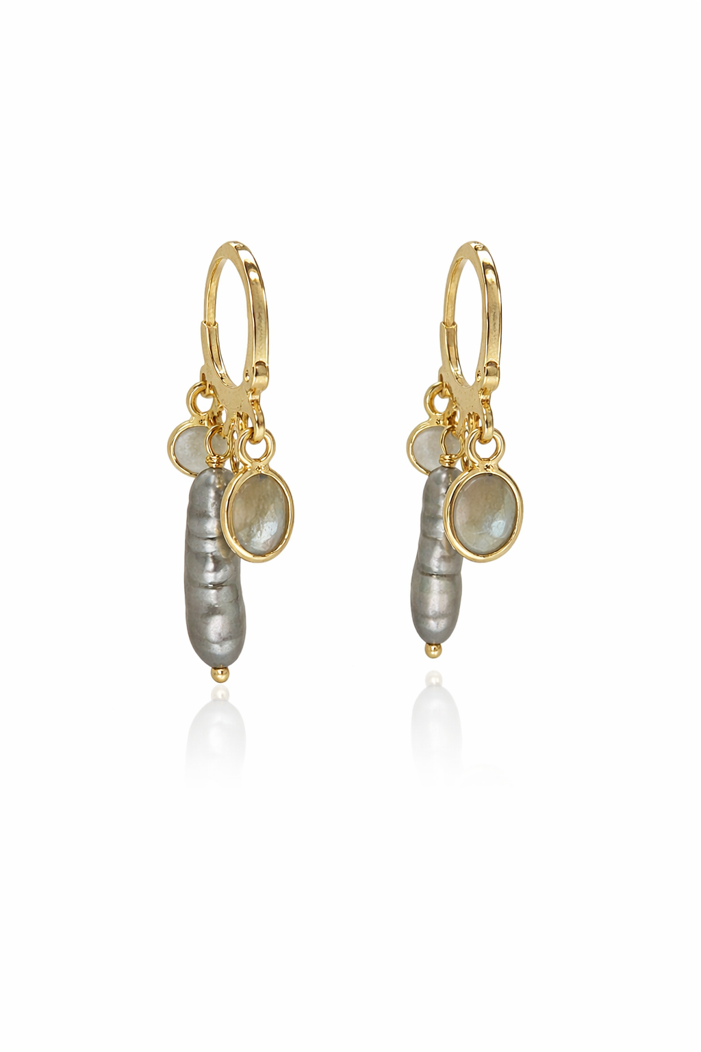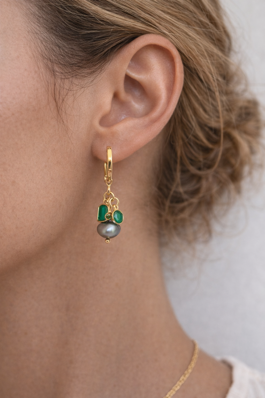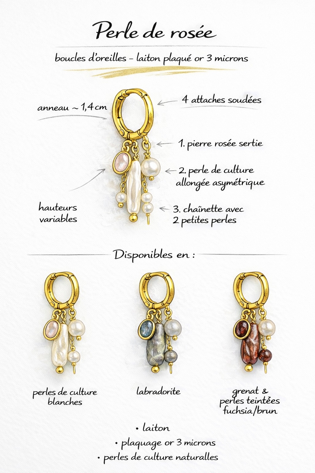 Les boucles Perle de rosée associent pierres naturelles et perles de culture dans une composition asymétrique à hauteurs variables. Trois éléments tombent librement depuis un anneau doré à 4 attaches soudées : une pierre sertie, une perle allongée baroque, et une chainette terminée par deux petites perles. Un bijou organique et féminin, conçu pour capter la lumière à chaque mouvement.