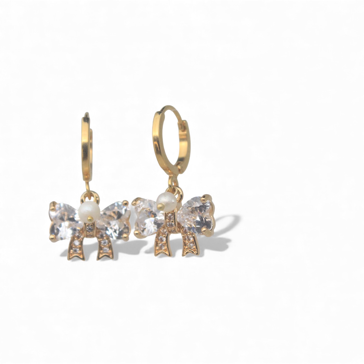Deux nœuds miniatures composés d’ailes en zircons taille cœur, rehaussés d’un pavage de strass, captent la lumière avec douceur.