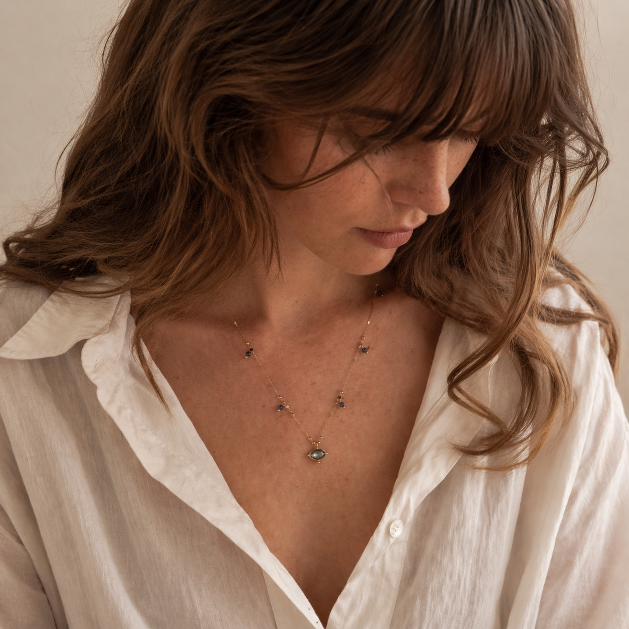 La chaîne se ponctue de petites pierres, comme en écho à la pierre centrale.
